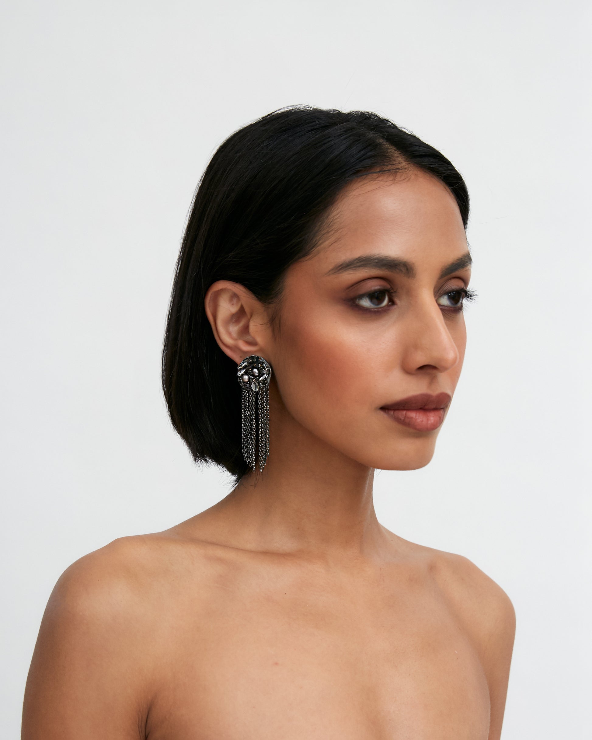 The Delphini Earrings are a captivating blend of elegance and movement. Featuring a circular design, these handcrafted earrings are adorned with an assortment of grey-toned crystals, carefully arranged for a sophisticated and harmonious look. The dangling chains add a sense of fluidity, catching the light with every movement.