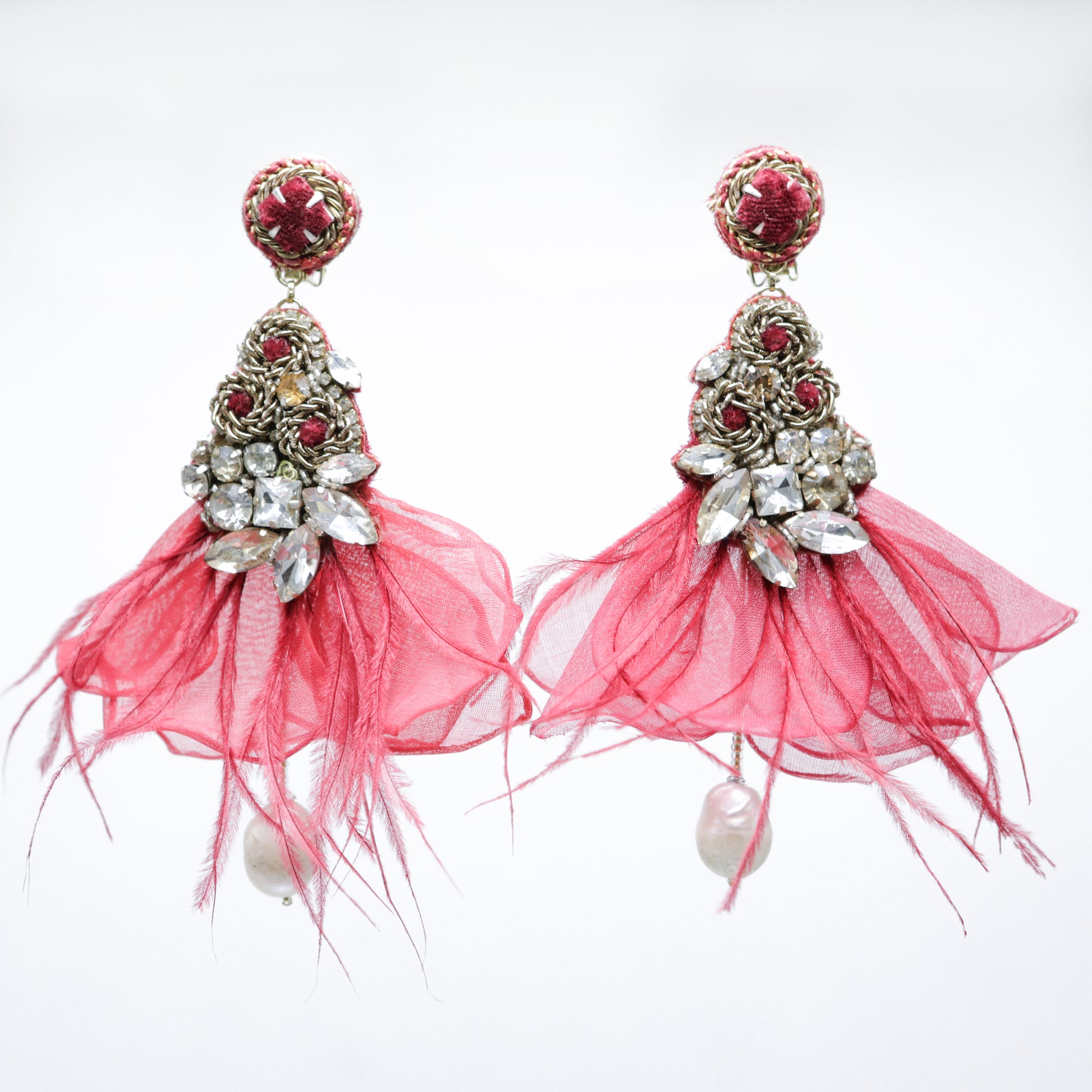 Hand rolled and organically dyed organza, feathers, pearls, glass.